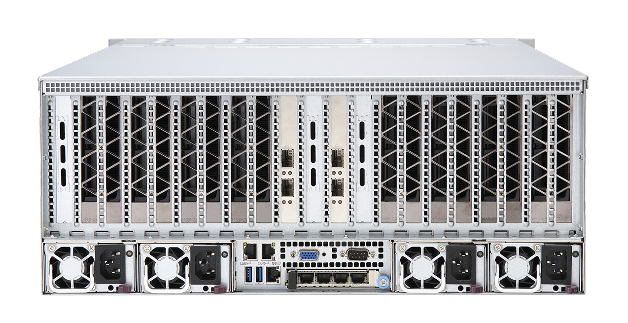 配置 10个PCI-E4.0 插槽,提供先进扩展能力,并可搭配 100G 以太网卡和 400G Infiniband 网卡;提供先进 IO 吞吐能力。