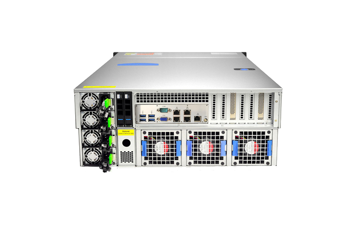10 个全高 PCIe 插卡位,最大支持 10 块双宽全长加速卡,最多支持 7 张单宽全长设备, 1* M.2(PCIEx4)2280、2210,板载 2 个 Oculink 接口。