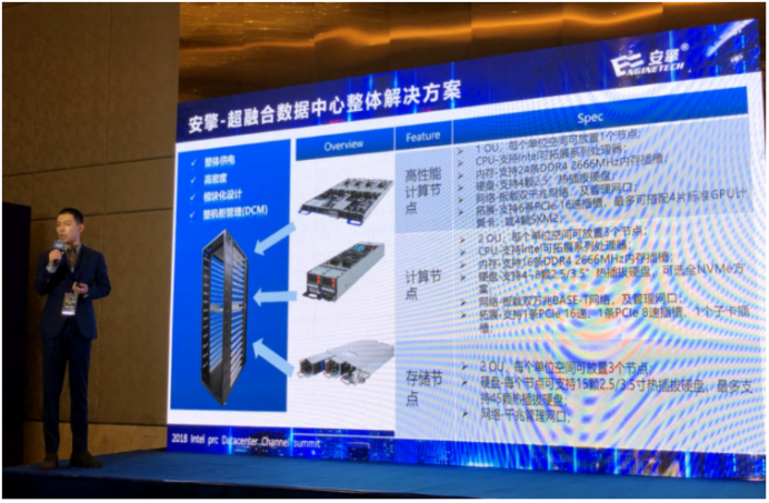 今年的数据中心渠道峰会上,安擎在“创新方案展示区”隆重推出安擎超融合数据中心一体化解决方案。该方案硬件部分采用模块化设计,由机柜、高性能计算节点、计算节点、存储节点以及电源模块组成。安擎超融合数据中心整体解决方案是安擎基于Intel的技术支持,结合十几年的行业经验与探索实践,针对数据中心的应用研发出的成果。为各行业提供了高效、灵活、易用、安全的软硬件一体化产品。